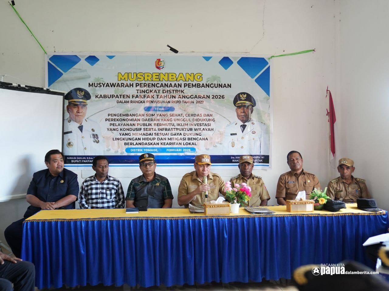 PAPUADALAMBERITA.COM. FAKFAK – Bupati Fakfak Samaun Dahlan, Sos., M.AP., didampingi Wakil Bupati Drs. Donatus Nimbitkendik, MT., dan Kepala Bappeda dan Litbang Fakfak, Abdul Razak I Rengen, S.H., M.Si., secara resmi membuka kegiatan Musyawarah Perencanaan Pembangunan (Musrenbang) tingkat Distrik Tomage, Selasa (24/02/2026).