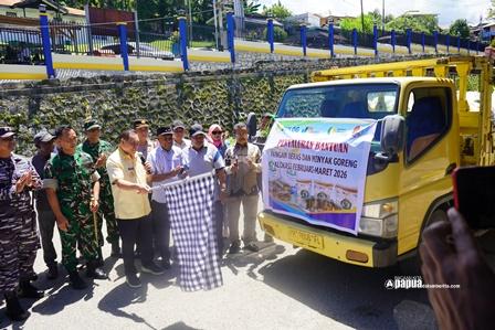 Bupati Fakfak Samaun Dahlan Bersama Wakil Bupati Drs. Donatus Nimbitkendik, MT., Dengan Didampingi Forkopimda dan Sekda Fakfak Sulaeman Uswanas Melepas Pendistribusian Penyaluran Bantuan Pangan Berupa 20 Kg Beras dan 4 Liter Minyak Goreng ke Masyarakat di 17 Distrik. Sabtu (25/04/2026). FOTO : ENRICO. PAPUADALAMBERITA.COM.