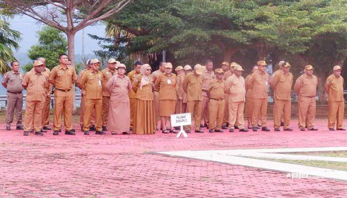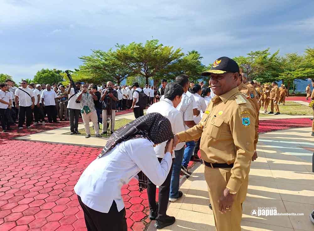 Sejumlah pegawai honorer menyalami Gubernur Papua Barat Dominggus Mandacan seusai apel pagi, Senin (1/1/2026), di Kantor Gubernur Papua Barat, Manokwari.FOTO: RUSTAM MADUBUN.PAPUADALAMBERITA.COM