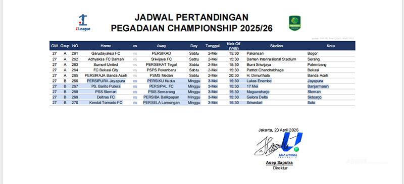 Direktur LIB, Asep Saputra, menandatangani perubahan ini pada Kamis, 23 April 2026, yang memindahkan pertandingan terakhir grup ke Minggu, 3 Mei 2026.