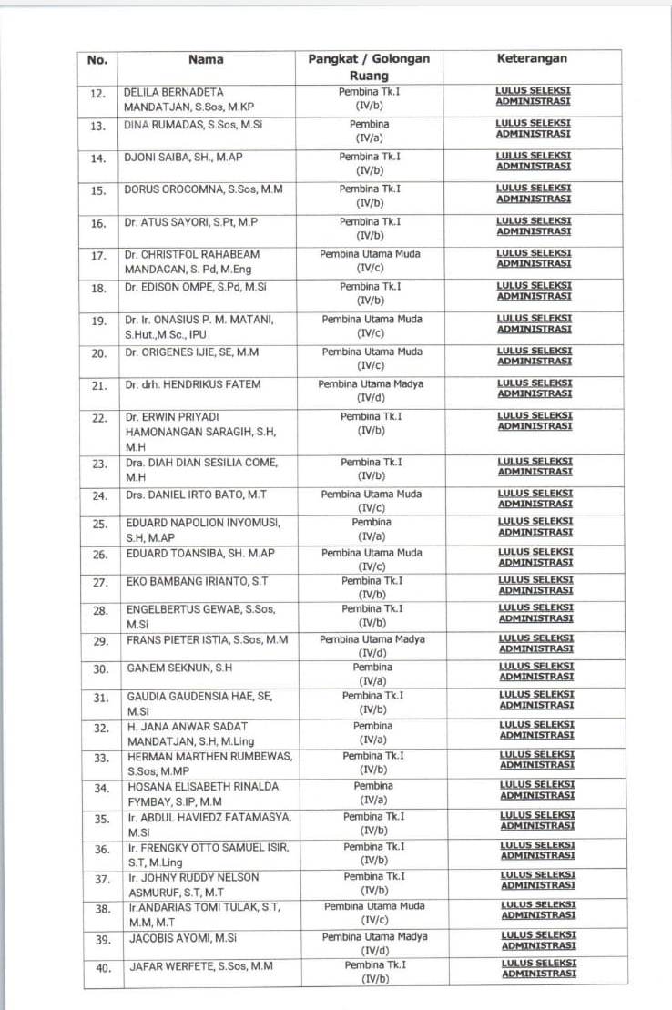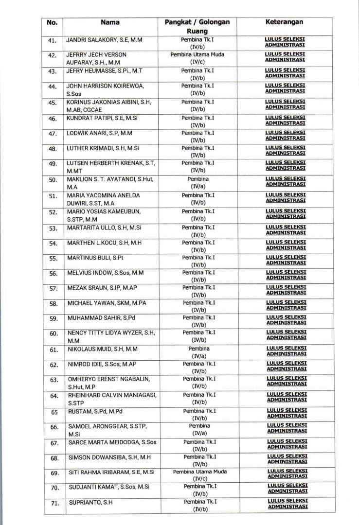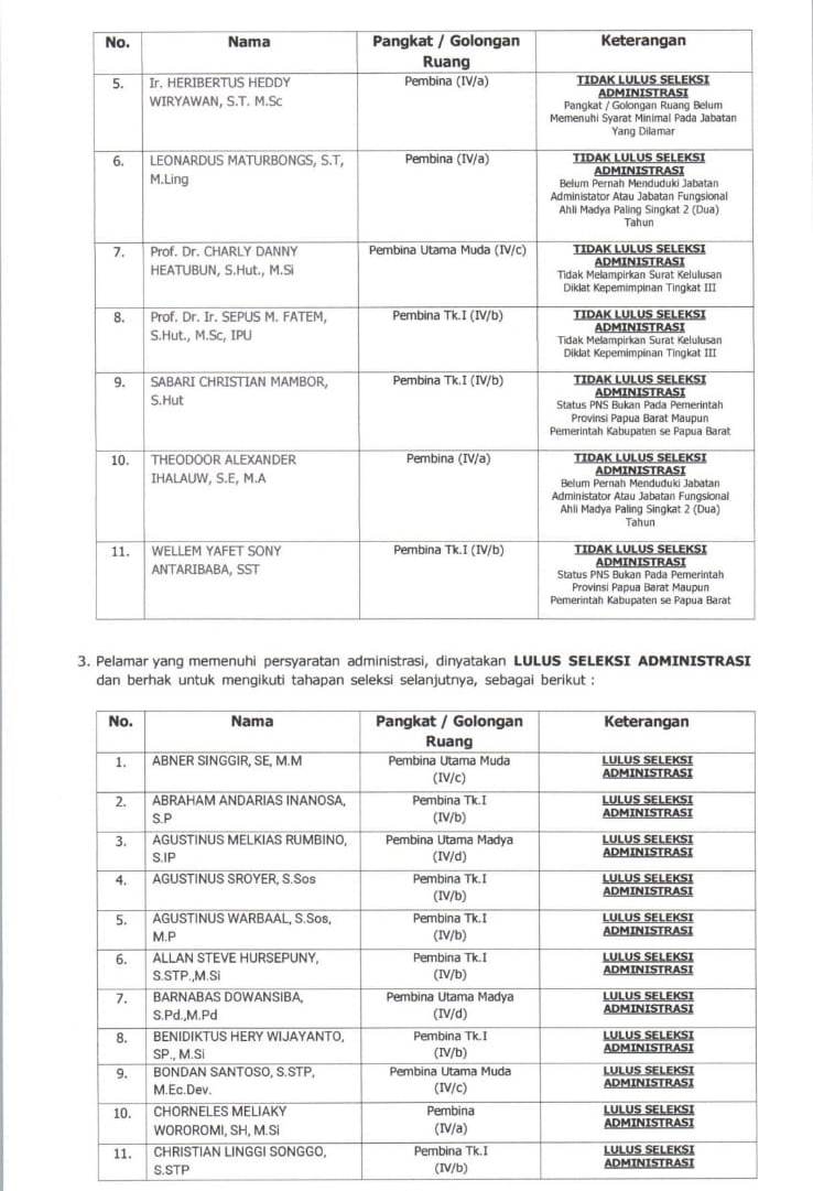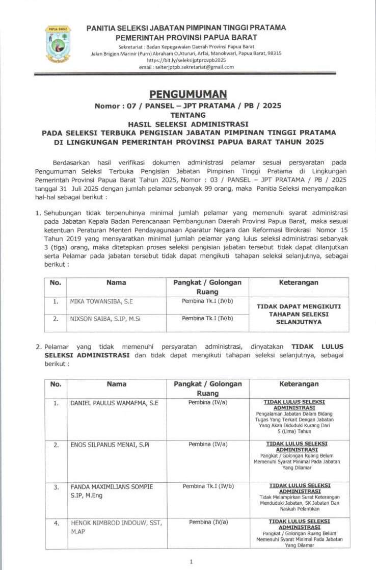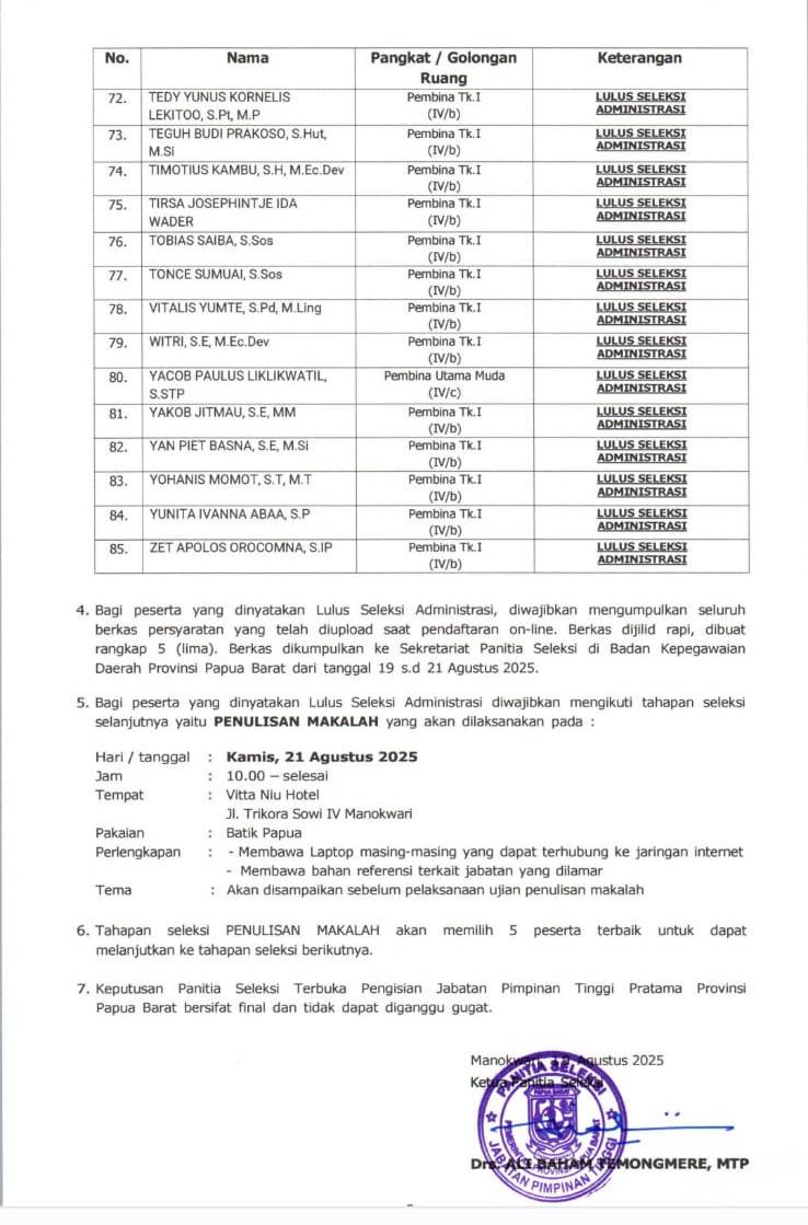 PAPUADALAMBERITA.COM.MANOKWARI– Panitia Seleksi Terbuka Pengisian Jabatan Pimpinan Tinggi (JPT) Pratama di lingkungan Pemerintah Provinsi Papua Barat mengumumkan hasil seleksi administrasi bagi para pelamar tahun 2025.
