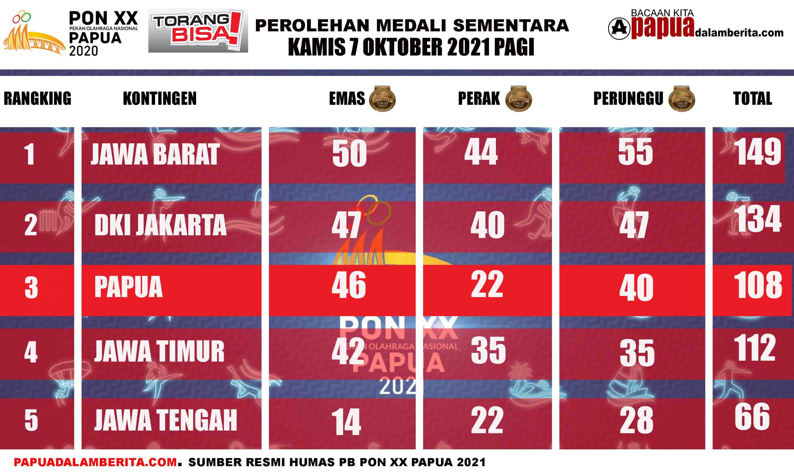 Berikut klasemen sementara perolehan medali pada PON XX Papua 2021 Kamis (7/10/2021) pagi. Hasil perolehan ini akan terus berubaha dalam hitungan jam sesuai hasil pertandingan cabang olahraga yang akan menyelsaikan pertandingan pagi, sore dan malam.(tam)