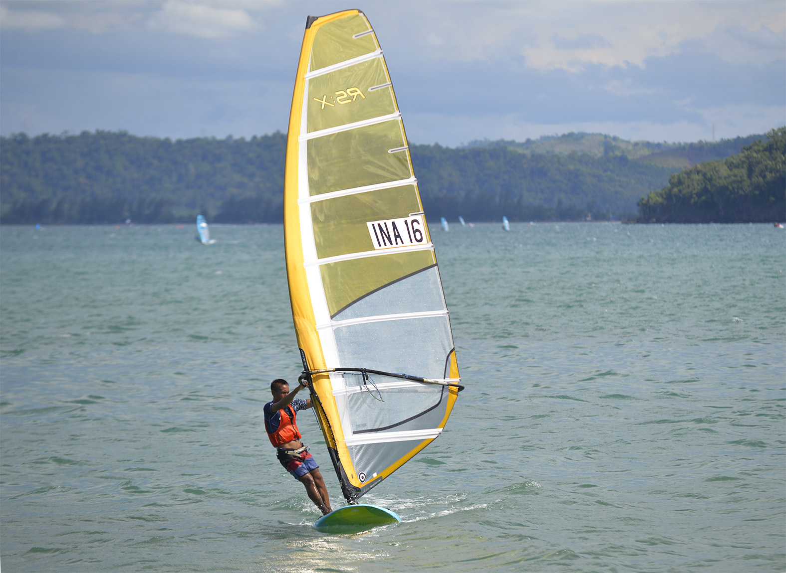 I Gede Subagiasa Atlet Papua Barat menyelesaikan Pertandingan Race ke 6 dihari kedua lomba Layar nomor kelas RS:X 9.5 Putra Kejuaraan PON XX Papua 2021 di Venue Pantai Hamadi, Kompleks TNI AL Kota Jayapura Papua. Senin(04/10/2021) Foto (PB.PON XX PAPUA/Ian Irman)