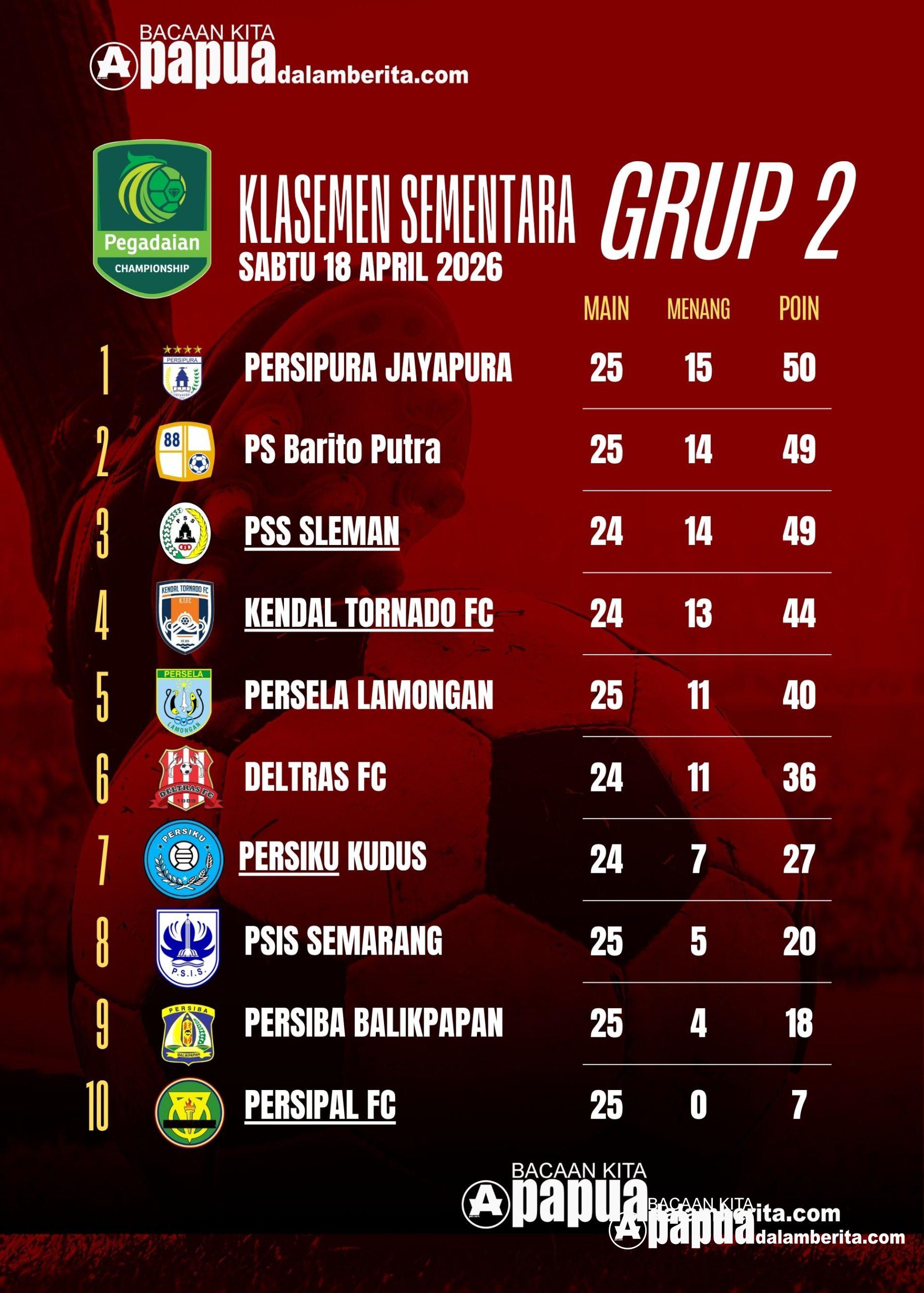 PAPUADALAMBERITA.COM.JAYAPURA – Persipura Jayapura memimpin klasemen sementara Grup 2 Pegadaian Championship 2025–2026 hingga Sabtu (18/4/2026), setelah menaklukkan PSIS Semarang dengan skor 3-1 pada pekan ke-26 di Stadion Lukas Enembe, Jayapura, Papua.