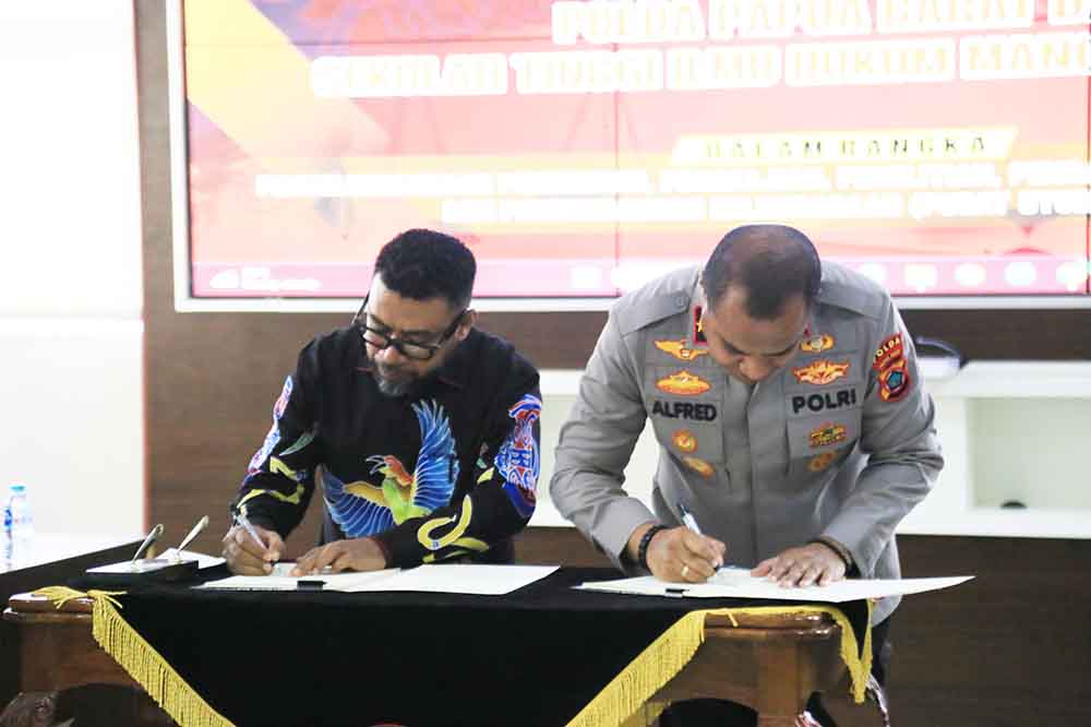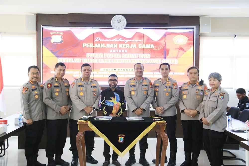 PAPUADALAMBERITA.COM.MANOKWARI- Polda Papua Barat menandatangani perjanjian kerja sama dengan Sekolah Tinggi Ilmu Hukum (STIH) Manokwari dalam rangka penyelenggaraan pendidikan, penelitian, pengabdian kepada masyarakat, serta pengembangan kelembagaan melalui pembentukan pusat studi kepolisian.