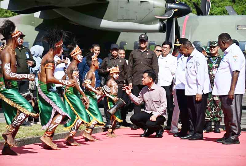 Setibanya di Bandara Marinda, Gibran disambut jajaran pemerintah daerah, Forum Koordinasi Pimpinan Daerah (Forkopimda), serta tokoh masyarakat.